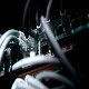Almost gray clip of working Ethernet switch with high close up, details with blinking LED lights