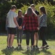 Group of christian college students in circle holding hands and praying for good exam results while standing on green grass on university campus. Young teenage friends showing unity on park lawn.