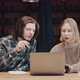 Group work concept. Portrait of two interested students making online research, discussing details of report on laptop, studying together at library
