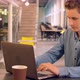 busy caucasian man sitting in office kitchen typing on laptop drinking coffee. handsome businessman has coffee break at work