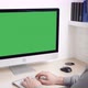man sitting at the workplace typing on keyboard computer with green screen minimalist workplace at home or office