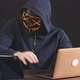 Hacker man studying bank card, try to find information and hack, male committing a crime using laptop.