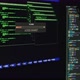 Silhouette of professional hacker in hoodie using computer with binary codes while sitting in dark room. Male web genius getting access into data center during cyber attack.