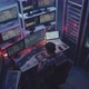 Full shot of a young hacker using a computer with multiple monitors