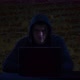 Front view of a young Caucasian man wearing a black hooded top looking around suspiciously and working on a laptop computer in the dark