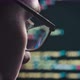 Close-up of a hacker’s face. A man with glasses looks at the monitor screen. He writes malicious code for the program. Colored symbols are visible on the screen