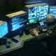 A male hacker surrounded by glowing monitors hacks into someone else’s computer network in a dark room of his office. Seamless looping animation for fiction, cyber and sci-fi backgrounds. A view of the hacker’s futuristic computer office.