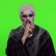 Shh be quiet. Sinister man with horrible scary Halloween zombie makeup in costume presses index finger to lips makes silence gesture sign do not tells secret. Dead guy with wounded bloody scars face