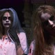 Halloween. Two zombie women are looking at the camera. The corpse of a bride and a mentally ill long-haired woman stand against a brick wall in an abandoned building. 4k