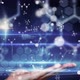 Animation of a hand touching a virtual interface with medical data on a dark background