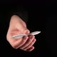 A hand with a jamb of marijuana appears from the darkness, as if inviting the viewer to smoke. Drug industry, concept
