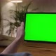 Handheld Camera: Over The Shoulder View Man Using Hand Gestures on Green Mock-up Screen Digital Tablet Computer in Landscape Mode. In the Background Cozy Living Room. Tapping on Center Screen