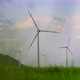 Handheld shot. A big green filed with lots of wind power plants. Investments in green energy. Green electricity concept.
