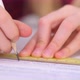 4k Hands close up. schoolgirl studying at home doing school homework. Training books and notebooks on table. Distance learning online education