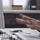 Close up tracking shot of hands of unrecognizable businessman sitting at desk and talking on online video call on computer