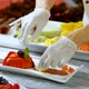 Hands quickly break bread. Small pieces of colored bread. Cafe chef decorates a flan. Cake with strawberries and custard.