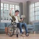 Happy Asian Man Sitting In A Wheelchair While Use Mobile Phone Playing Video Game And Celebrating At Home