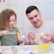 Family painted eggs at home. Little daughter and dad painted eggs at home. Daughter kisses Dad on cheek. Kiss the baby. A daughter’s love for her father. Happy easter. A father and daughter painting eggs with brush. Happy family smiling and laughing.