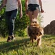 Happy Young Married Couple Walks with Two Dogs in a Glade in the Forest. Girl with her boyfriend stroll on a green lawn with puppies. Slow motion. Close up.