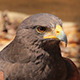 A trained falcon waiting to perform outside. Good for falconry, hunting, animals, birds, predator, birds of prey, and more.