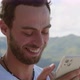 Connected to internet guy using mobile phone browses the web and news feed standing outdoors on the nature background