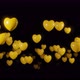 Yellow glossy plastic hearts explosion loop. 3D heart symbols rising high and falling down. Isolated on black background.