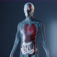 Heart position animation between other internal organs and skeleton on blue background. 3D render medical animation.