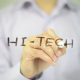 Man, Businessman, entrepreneur, freelancer, software engineer, programmer writes on transparent wall : Hi-Tech