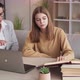 Home study. Knowledge testing. Catch-up classes. Female teacher with teenager girl checking tasks in books and laptop sitting light room interior.