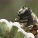 Macro shot of Hoverfly on a white flower cleaning its paws and eyes.