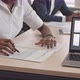 Tilting up of young African American female HR manager wearing white shirt, sitting at conference table in office, looking at documents, having business interview with unrecognizable applicant