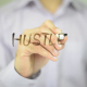 Man, Businessman, entrepreneur, stock trader, analyst or banker writes on transparent wall : Hustle