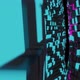 Hyper space of moving cubes in black, blue and purple colors. Animation of tunnel flying through making loops. Motion graphics, computer generated.