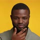 Idea Concept. Pensive Black Guy Touching Chin And Pointing Finger Up, Cheerful Young African American Man Having Inspiration, Found Problem Solution, Standing On Yellow Background, Slow Motion