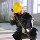 In front of the camera in a large space construction building working in front of the camera construction worker using heavy building materials. Shot on ARRI Alexa Mini.