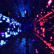 Blue dark sci-fi bg fly through tech digital space like in tunnel with neon light. Concept of hi-tech information flow, blockchain. 3d looped bg motion design, cubes and spheres, constructions. Dark dynamic bg, complex technogenic environment,