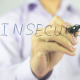 Man, Businessman, entrepreneur, creative designer, freelancer writes and draws on transparent wall : Insecure