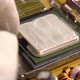 Inserts a central processor onto the motherboard. The processing system of the central processes of the PC. Many different chips. View of the computer parsed. 4k