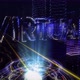 Inside an augmented reality. The word Virtual made of moving data streams appears in front of the viewer. Projection effects. Bold 3D letters. Computer graphics. Symbols. Virtual reality. Code