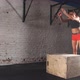 Fit Athletic Woman Does Box Jumps in the Deserted Factory Gym. Intense Exercise is Part of Her Daily Cross Fitness Training Program.