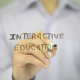 Man, teacher, student, professor writes on transparent wall : Interactive Education