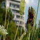 Many interesting bugs perched on a plant closeup shot. The weather is windy. In the background is visible building.