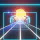 Interstellar Highway. Space road to yellow star with fantastic designs. Blue orange light. Cyan neon frames.