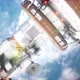 A spaceship interstellar flies over a blue beautiful planet. The animation is for fantastic, the futuristic or space travel backgrounds. View of the spacecraft in the space. View of the futuristic spaceship in the space.