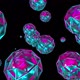 Balls enclosed in rhombic mesh 3d render sweep across surface. Holographic shapes with gradient reflection metallic and graphic gloss in spherical reflections.