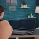 IT student using programming interface and binary code on laptop, learning system data and coding statistics. Young person looking at analysis hacker information on computer screen.