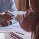 Close up of man sitting at desk, shaking entered woman hand and then asking her to seat by hand gesture. Woman giving him CV
