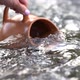 Slow immersion of the jug into the bubbling river and its filling.