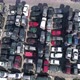 Aerial panoramic view metal scrap as waste collected in a part at junkyard scrap yard for recycling
