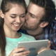 Close up of young woman sitting on the sofa and browsing internet while her boyfriend unpacking things